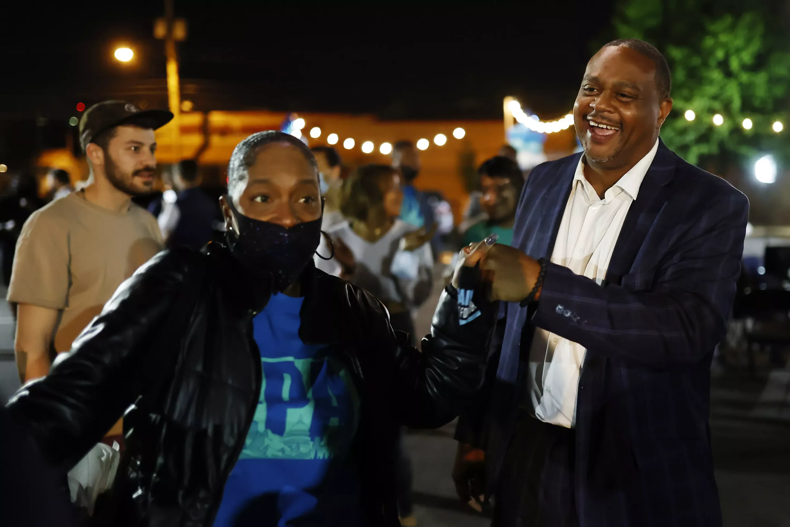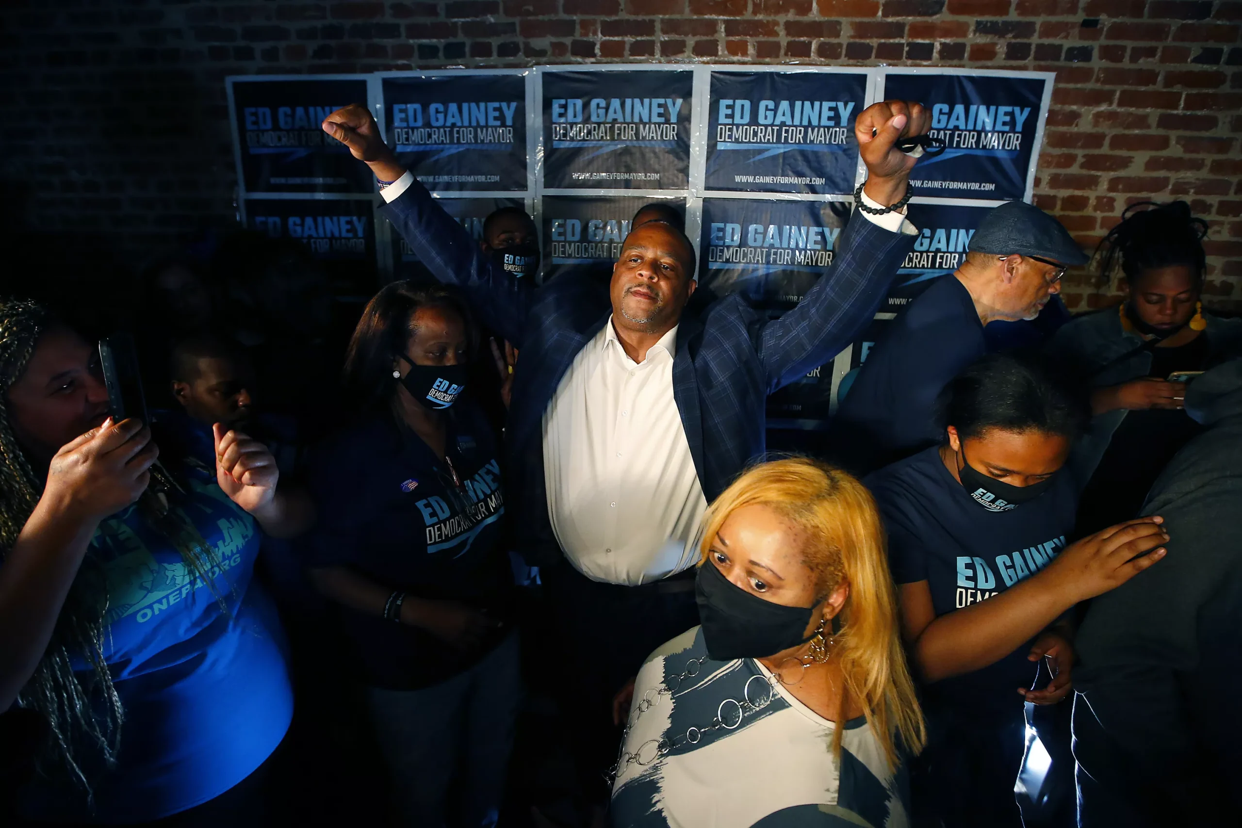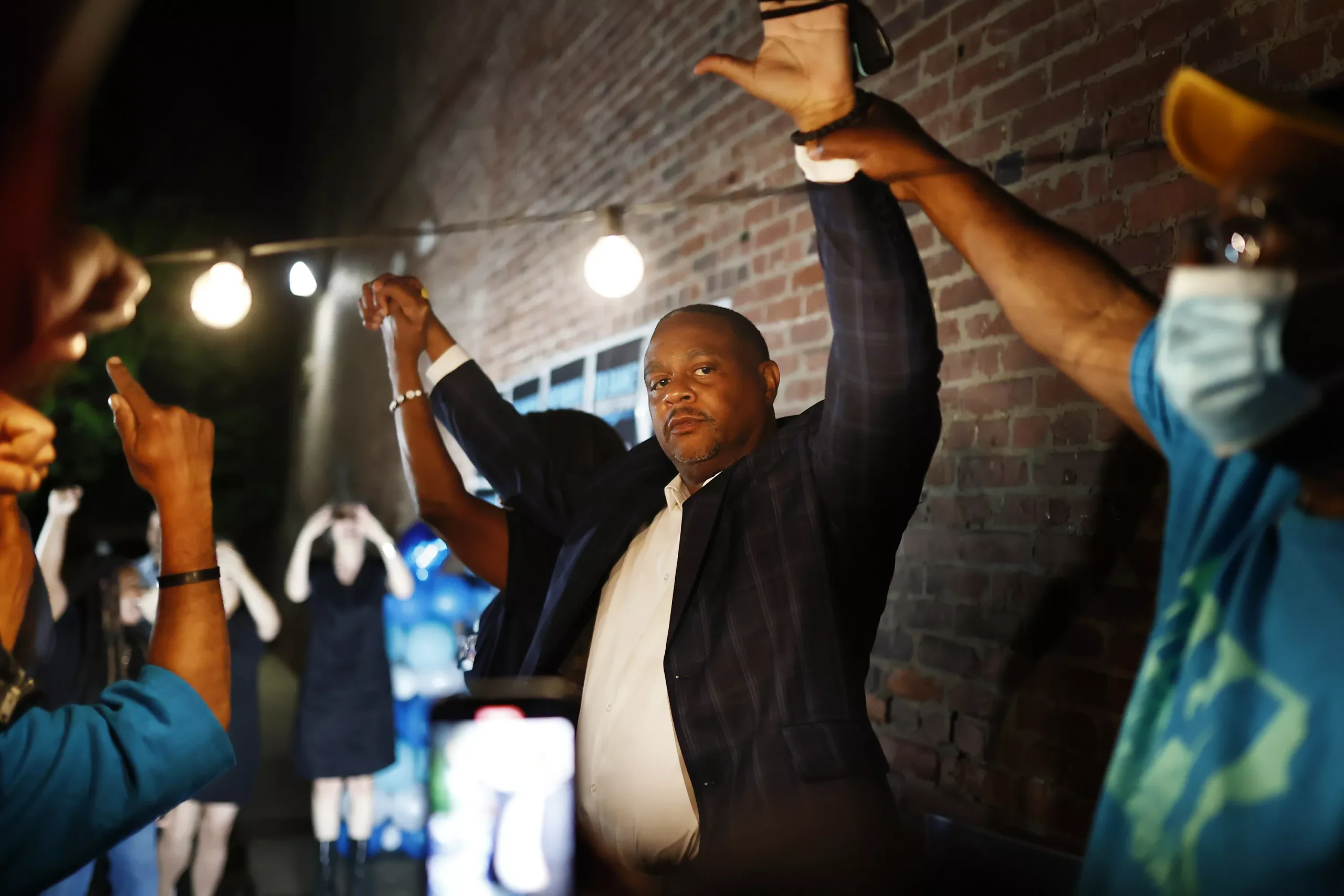Democratic Mayoral candidate Ed Gainey celebrates after incumbent Bill Peduto conceded during his watch party at the OnePA offices in the North Side. Credit: CP Photo: Jared Wickerham