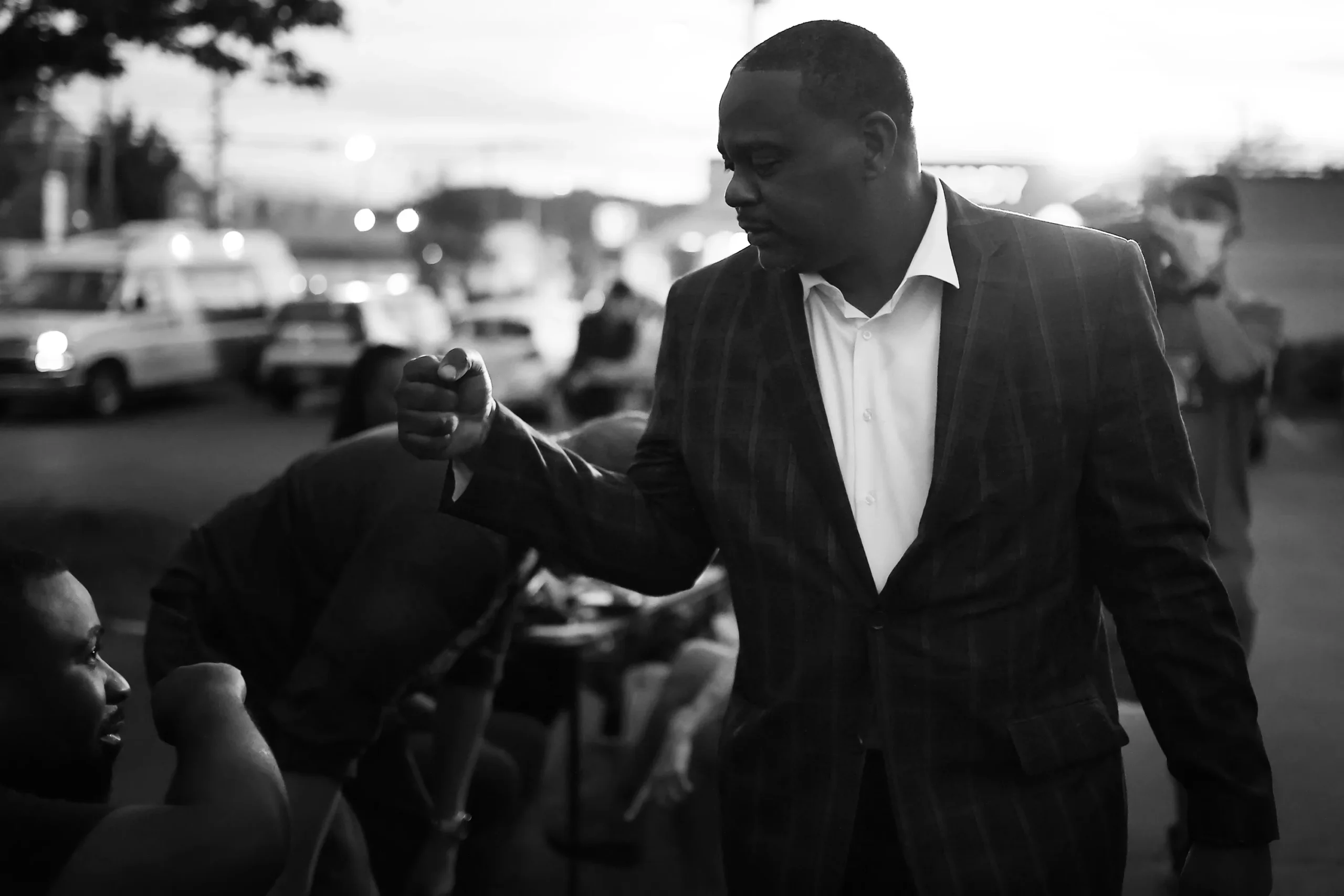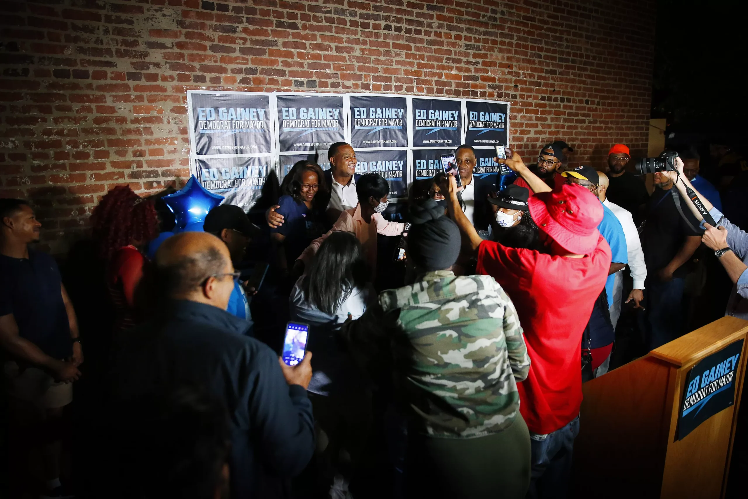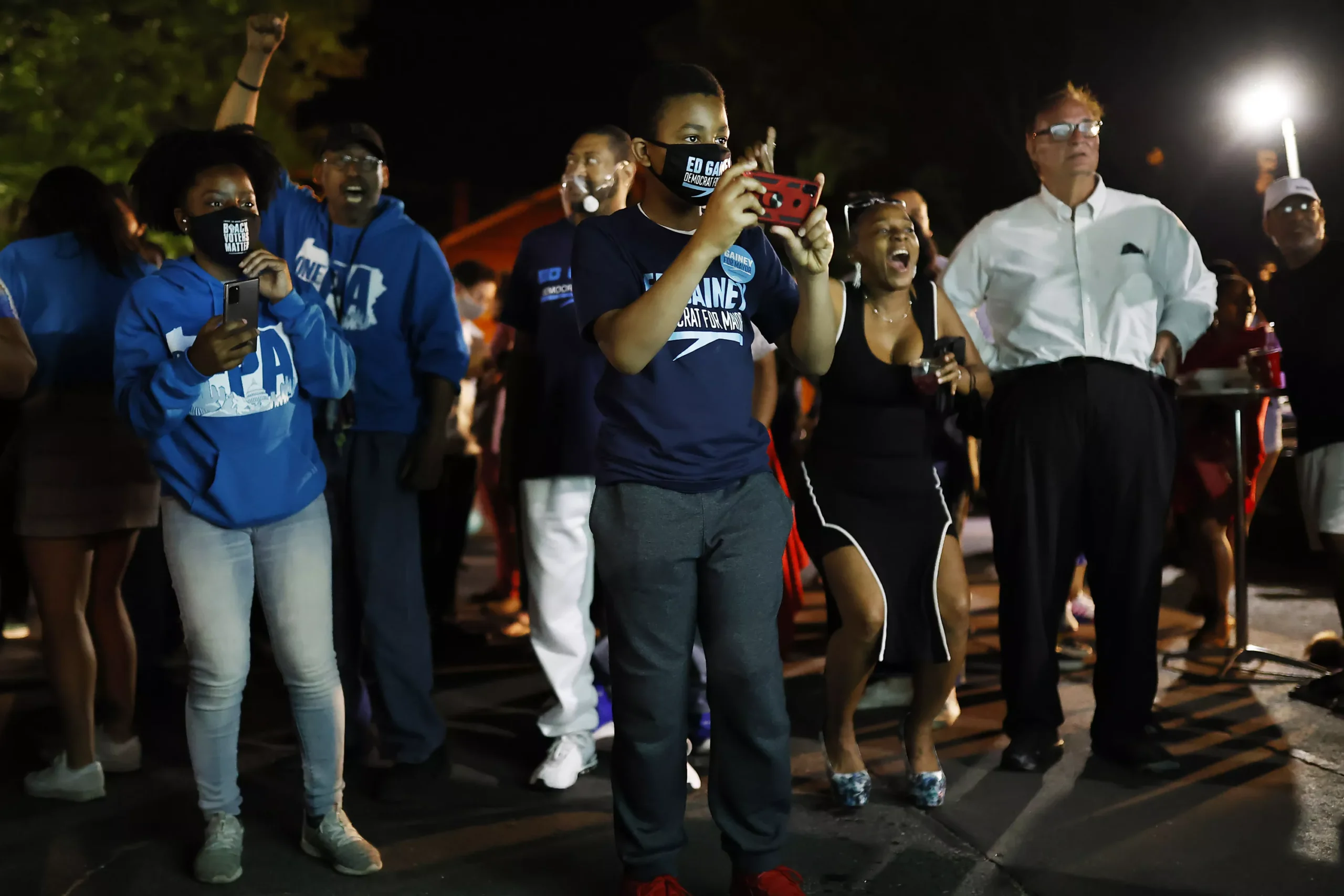 Democratic Mayoral candidate Ed Gainey celebrates after incumbent Bill Peduto conceded during his watch party at the OnePA offices in the North Side. Credit: CP Photo: Jared Wickerham