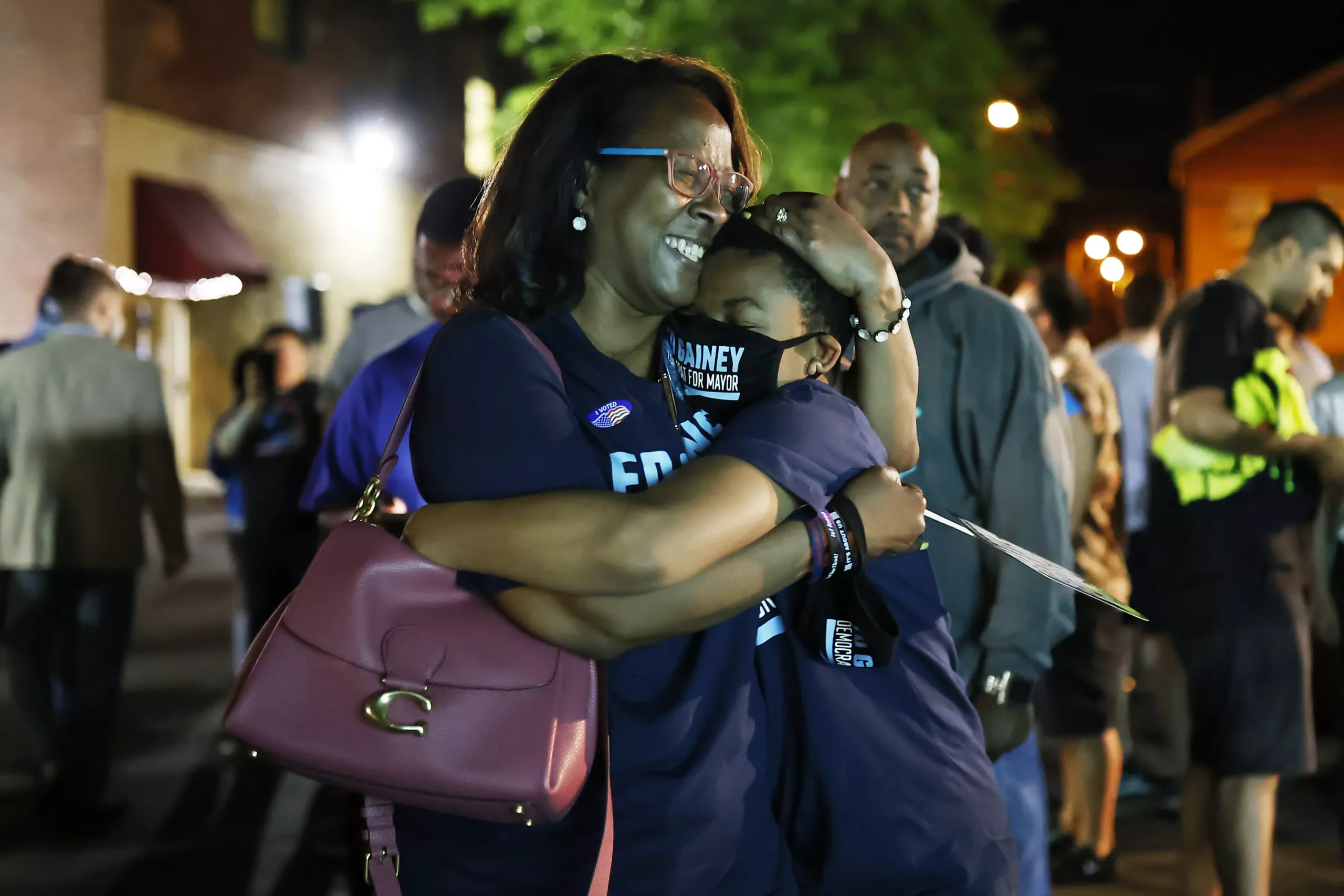 The son of mayoral candidate Ed Gainey, Darius, hugs his mom Michelle after Ed Gainey took the lead against incumbent Bill Peduto during his watch party. Credit: CP Photo: Jared Wickerham
