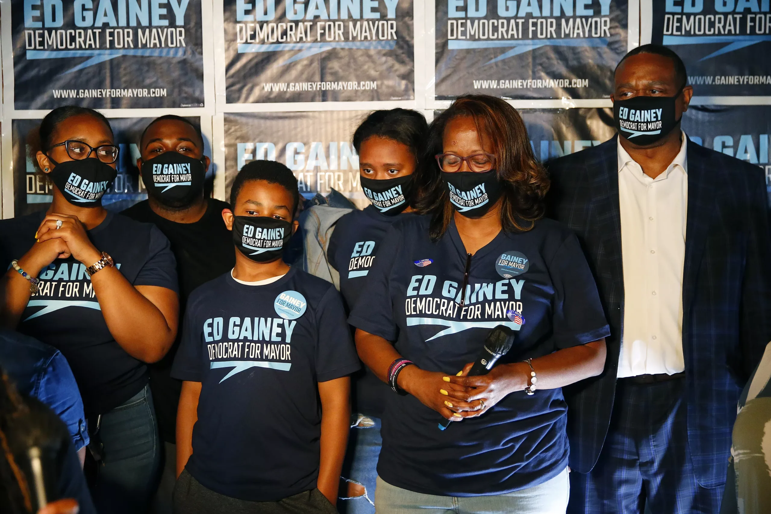 Mayoral candidate Ed Gainey and his family stand on stage before his acceptance speech. Credit: CP Photo: Jared Wickerham