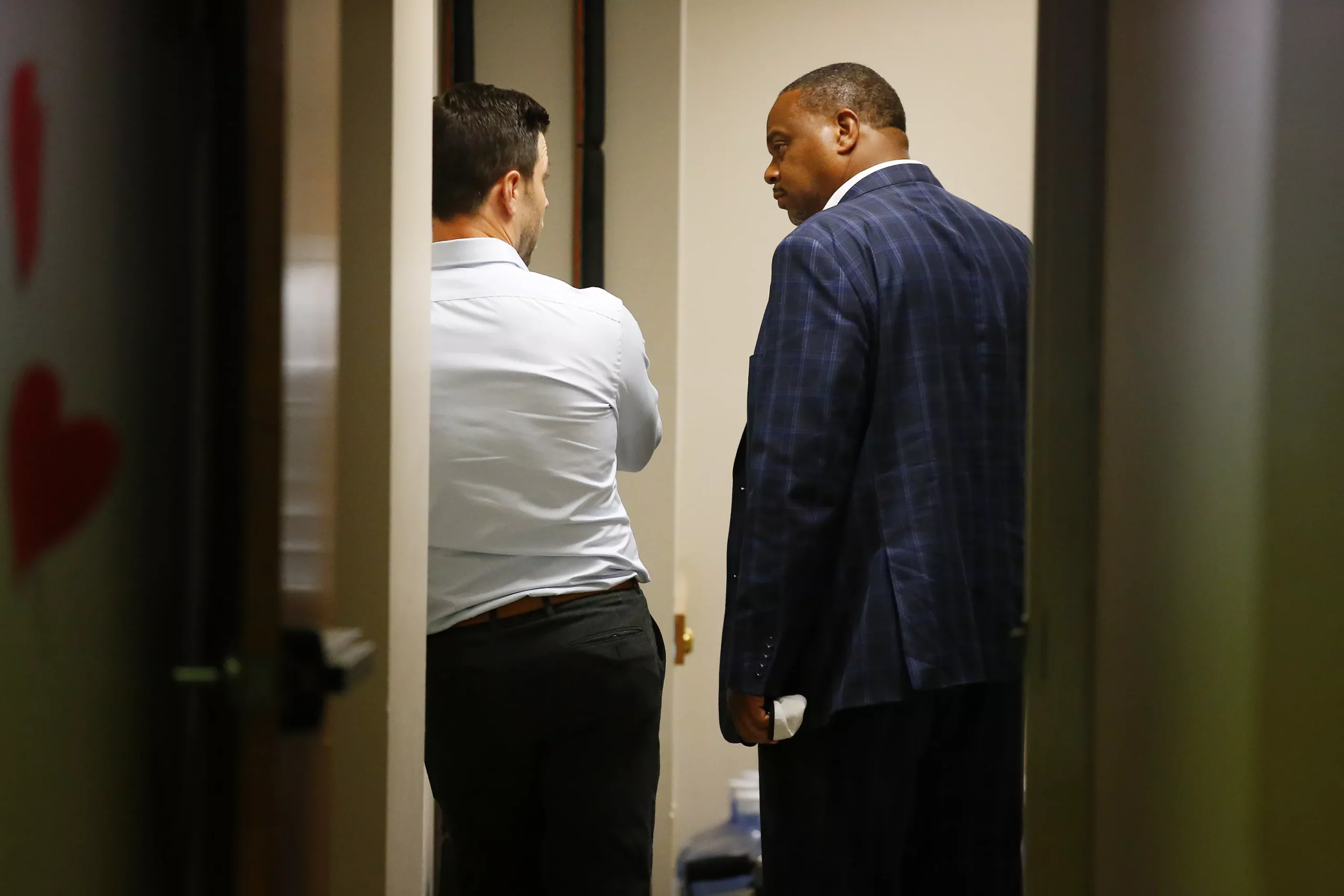 Mayoral candidate Ed Gainey talks with Silas Russell, Vice President of the SEIU Healthcare PA during his watch party at the OnePA offices. Credit: CP Photo: Jared Wickerham