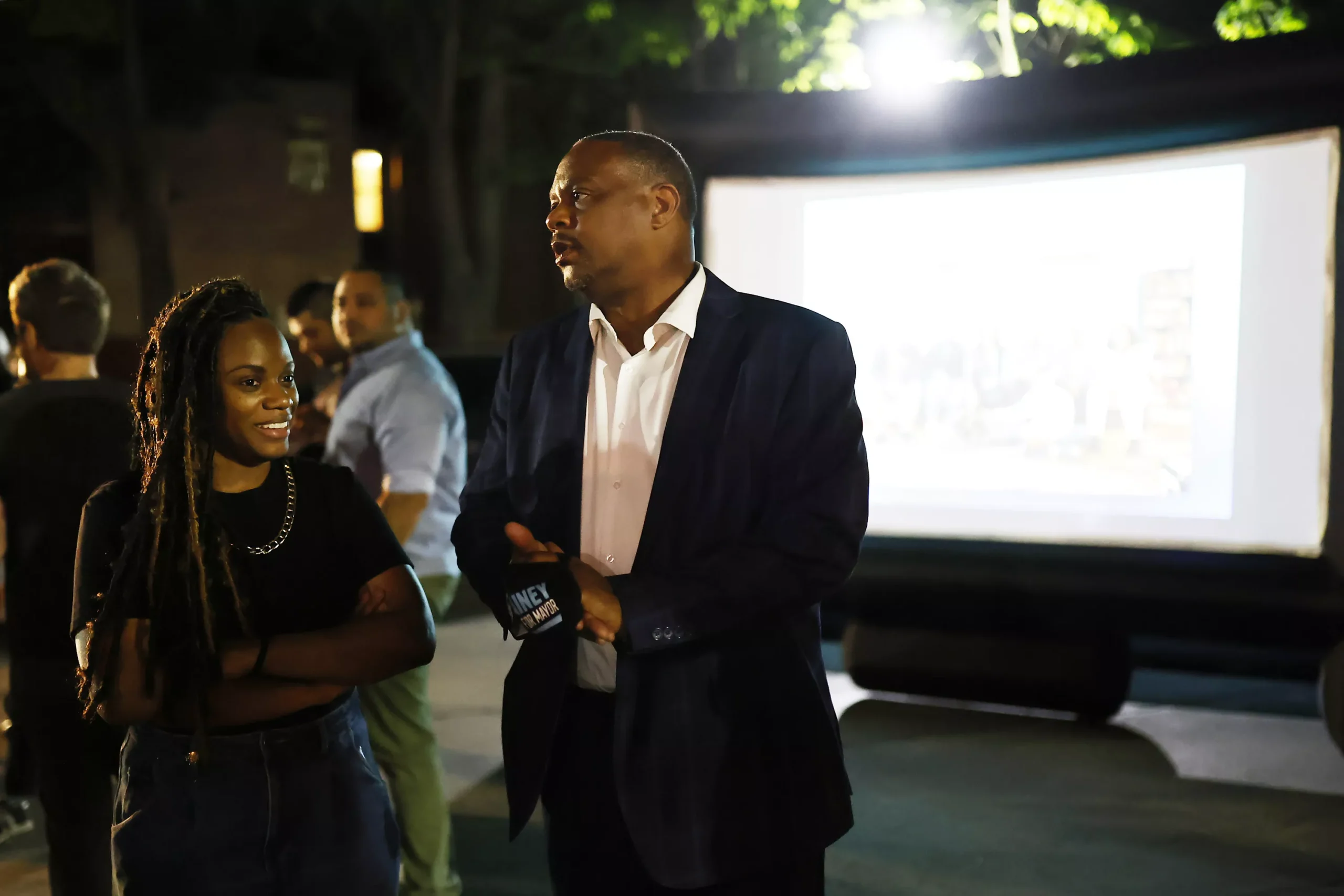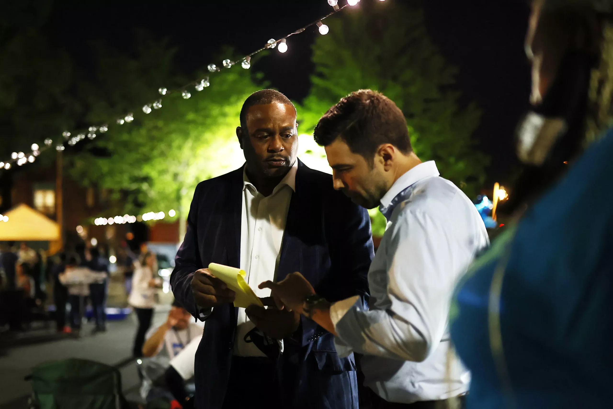 Mayoral candidate Ed Gainey speaks with Rep. Summer Lee during his watch party at the OnePA offices. Credit: CP Photo: Jared Wickerham