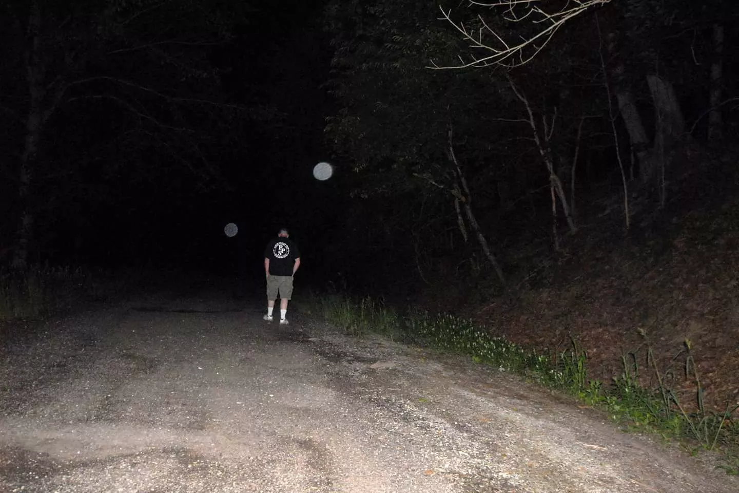 Shawn Kelly investigating Blue Mist Rd. in 2017, with photo showing “solid orbs.” Credit: Photo: Courtesy of Pittsburgh Paranormal Society