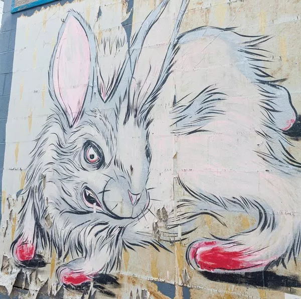 Feral Bunny Wall Art. That’s one angry rabbit “ONE TON ONE” wheat-pasted to an old parking kiosk. Love them red feet. Forward Street and Murray Avenue, in Squirrel Hill