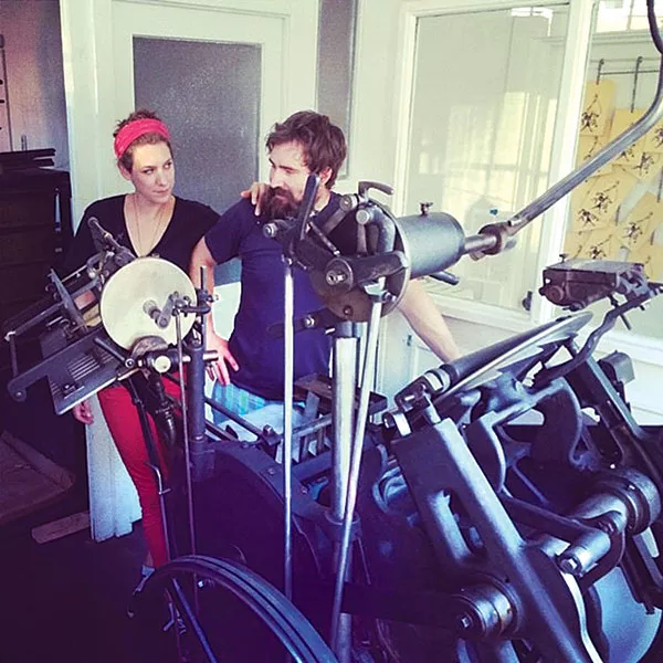 Tip Type. An artist’s space and letterpress print shop housed in a former Wilkinsburg typesetting shop. Pictured are the owners, Brandon and Manya, next to their awesome Chandler & Price Platen Press. www.tiptype.co