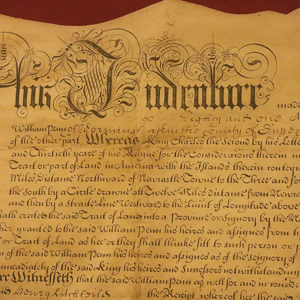 Land Grant Signed by William Penn. A first-floor historical display at the Omni William Penn Hotel Downtown includes this framed document from 1681, granting Penn 500 acres in what’s now Chester County for 10 pounds. It’s a genuine artifact from the year the commonwealth was founded. 530 William Penn Place