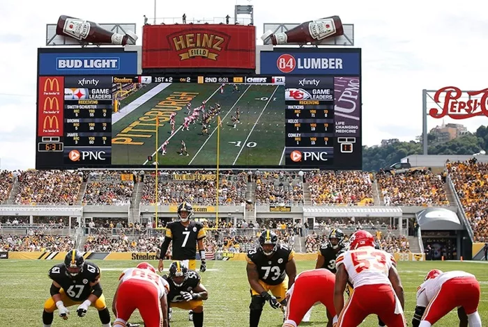 Two football teams, one wearing black and gold uniforms and the other wearing red and white uniforms, get into position at the former Heinz Field in Pittsburgh.