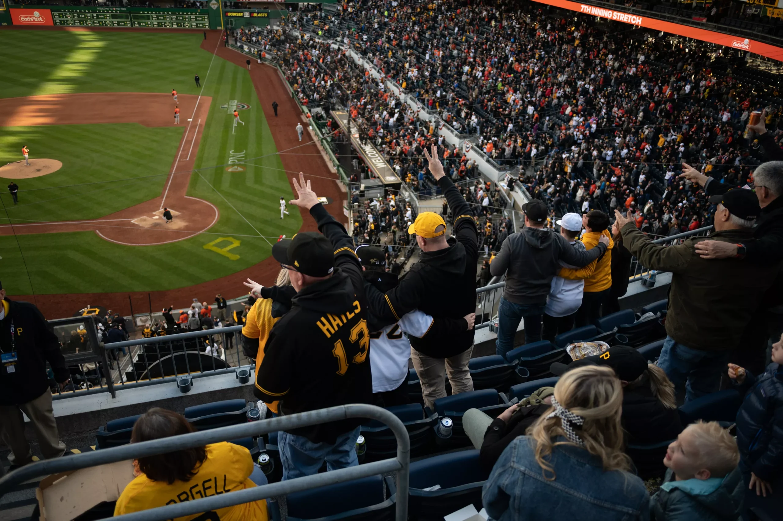 Fans participate in the seventh inning stretch at PNC Park. Credit: CP Photo: Mars Johnson