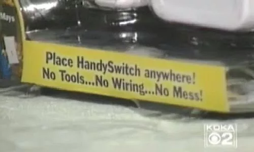 Summary: Move over, Clapper — there’s a new on-off switch in town! Station: KDKA Channel 2 Reporter: Yvonne Zanos When It Aired: April 24 Running Time: 4 minutes, 8 seconds Visuals: * Our female co-tester settling down on her sofa with a book, knowing that soon, darkness will fall, and the inevitable will happen: She will have to stand up, reach over, or worse yet — perhaps even walk across the room — to turn on a lamp. Highlights: * When anchor Ken Rice bloviates, “The best reporters take nothing at face value. Following rule number one of journalism: If your mother tells you she loves you, check it out. That’s the kind of good, old-fashioned, hard-boiled skepticism that consumer editor Yvonne Zanos brings to every installment of ‘Does it Really Do That?'” * When Zanos responds, “Whoa. What an introduction! And that’s right: Here at KDKA we want to find out for ourselves. So, what about the HandySwitch? It claims to be a product for people who are tired of getting up to turn off the lights. It sells for $19.99; it’s a wireless remote for your lamps.”* A scene from the product’s infomercial: “HI! BILLY MAYS HERE FOR THE HANDYSWITCH! THE NEW WIRELESS LIGHT SWITCH THAT LETS YOU CONTROL ANY LAMP FROM ANYWHERE!” * When Zanos reveals, “The hardest part is trying to remove the product from its plastic packaging.” * When Zanos, her co-tester and her 13-year-old son simultaneously “ooooooh” after the switch works. * When Zanos reminds us not to get too excited, yet: “But that’s just a few feet away. … This product is supposed to work from the outside, too — up to 60 feet away. So we go out in the front yard.” After the HandySwitch does its magic again, they all scream in unison, “It worked!” * When Zanos really pushes the envelope: “And finally, we take the HandySwitch to its limit, two houses away.” * When Zanos reports, “The lamp does not come on. And what about that promise that you can drive home with the HandySwitch in your car and turn on the lights in your dark home? The first time we tried it, it didn’t work, but the second time, it did.” * When Zanos concludes: “[W]e do give HandySwitch a definite thumbs-up.” What We Learned: If necessity is the mother of invention, laziness must be its evil cousin. Unanswered Question: What — there’s no device to give a “thumbs-up” for you? News Value: 4. Now that’s what I call living on the edge, Yvonne!