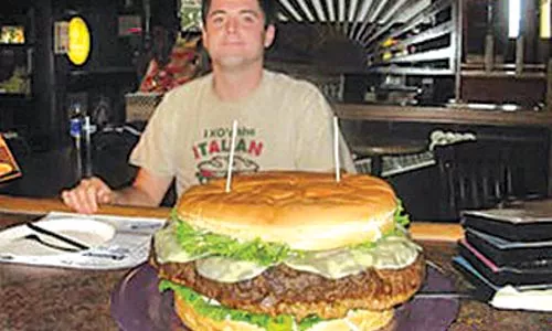Summary: Brad Sciullo becomes the first to devour a giant hamburger … just because. Reporter: Trina Orlando, KDKA Channel 2 Airtime: 2 minutes, 35 seconds on Oct. 17 Visuals: *Inside Denny’s Beer Barrel Pub in Clearfield, Pa., where the mammoth burger is served. Highlights: * When anchor Ken Rice describes the “Beer Barrel Belly Buster” as “a 15-pound hamburger with another 5 pounds of toppings,” and asks, “Trina, was [Sciullo] in much discomfort?” * When Orlando, standing outside in Fayette County farmland and speaking at warp speed, says, “You know, he was doing all right now, but remember, this happened about five days ago. … The burger that he ate … [is] equal to roughly 60 of these quarter-pound burgers that most of us can fill up on for dinner.” * When Orlando speaks of Sciullo’s insatiable appetite: “Sciullo can eat raviolis faster than most of us can count them. When it comes to wings, he can devour a half dozen in about 30 seconds. This weekend, Brad conquered one of the biggest hamburgers in the world.” * When Sciullo describes his technique: “You have to keep focused — you can’t let your mind beat you. Almost don’t look at it. Just keep chewing, keep moving your hands, keep working your jaws. I didn’t talk the whole time. I just kept in concentration.” * When Orlando elaborates, “Brad is also the world cannoli-eating champion and right now, he is training to compete against some of the fastest hot-dog eaters in the world.” * When Sciullo reveals his daily training regimen: “I do 40 pieces of bubblegum, 20 minutes a day nonstop as fast as I can. That’s the ‘badlands technique.’ It was taught to me by one of the veteran eaters.” * When Orlando tells us, “When Brad isn’t eating, you’ll find him cooking at Pasta Lorenzo in Uniontown, where he challenges other people to eat this sandwich called the ‘Italian Stallion.’ Back in Clearfield, there is another burger called the ‘Belly Bruiser’ that weighs in at 50 pounds. Today, we asked Brad if he would be stepping up to the plate.” * When Sciullo contemplates, “Well, I don’t know. … That’s a banquet burger.” * When Orlando ends, “Now the Italian Stallion … if you eat it in under an hour you get a free T-shirt. If you’re wondering if it’s possible, Brad did it in just eight-and-a-half minutes.” What We Learned: People will do anything for a free T-shirt. Unanswered Question: Seriously — how do we really know this is one of the biggest hamburgers in the world? Facts, Trina, give us facts! News Value: 2. Slow down, Orlando. If Sciullo chews as fast as you babble, it’s no wonder he’s the champ.