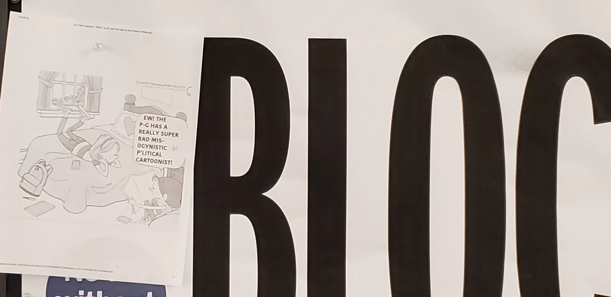 Update 2/15: Sources at the P-G who wish to remain anonymous sent City Paper a photo showing a mocking depiction of one of Kelley’s sexist cartoons. The cartoon was placed over top the “Shame on the Blocks” poster that the Newspaper Guild of Pittsburgh put up in protest of Block. The cartoon originally said “Maybe one day I will grow up and divorce a man like Jeff Bezos,” but the parody version reads “Ew! The P-G has a really super bad misogynistic p’litical cartoonist!” The guild put out a statement condemning the original cartoon shortly after CP reported on it in January. Sources tell CP the mocking cartoon (shown below) is still placed over the “Shame on the Blocks” sign in the P-G offices.