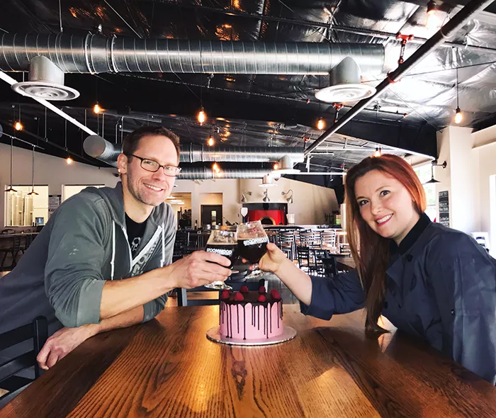 The base is Spoonwood’s stout recipe, using dark-roasted grains and caramel malts. Then, 40 pounds of the bakery’s cake is added in, along with raspberry purée.
