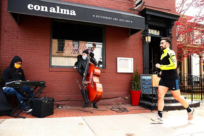 Howie Alexander and Tony DePaolis play in front of Con Alma in Shadyside. Credit: CP photo: Jared Wickerham
