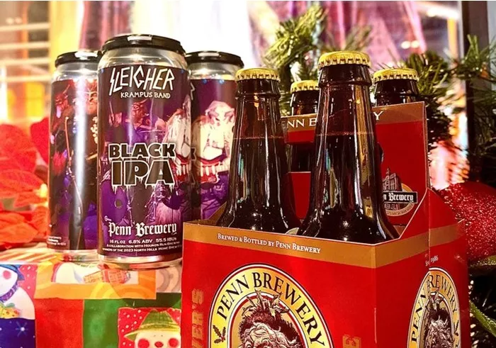 Spooky season continues into the winter holidays with a new beer from Penn Brewery. The company partnered with Hounds Run Brewing to create the Sleigher Krampus Band Black IPA, a Black IPA fit for a Pittsburgh band that mashes up rock, metal, and punk songs with Christmas carols and performs in costume as the horned, goat-like legend. The new seasonal addition launches at Penn Brewery on Fri., Dec. 1 with a free event followed by an all-ages concert by Sleigher (wicked children beware). Afterward, the beer will be sold in four-packs for a limited time at Penn Brewery’s North Side and airport locations. You can also snag the IPA on Tue., Dec. 5 at the eighth annual Krampusnacht Festival in Market Square, and at Sleigher – Krampus Band’s Twisted Christmas Holiday Party on Sat., Dec. 16 at Thunderbird Music Hall.