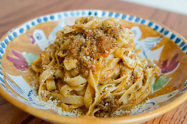 Make a volcano with the flour, and crack the eggs in center. With a fork, beat the eggs until they are scrambled. Mix together with the flour until the dough is formed. Add water as needed if the dough is too dry. Once the dough comes together, knead for 10 minutes. Cover and refrigerate for two hours. Pull out and roll out dough with a rolling pin, until it’s 1/8-inch thick. Fold over three times, dusting with flour in between, then cut into ¼-inch-thick ribbons. In a large pot of salted boiling water, add the pasta, stir and let cook for three minutes, or until al dente. This tagliatelle is best served with a meat sauce, like a Bolognese. Serves four.