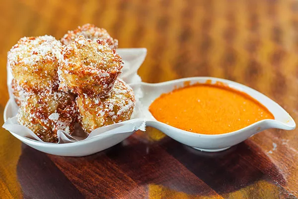 The chef’s tapas for two provided a curated tour of the menu and a surprising amount of food for the money. Served on a curved oak-barrel stave — a creative way to avoid crowding the table with dishes — it offered extra-small portions of five snacks and small plates. Baked oysters were spicy and a bit creamy, yet the brine just came through. Silver-dollar-sized kimchi pancakes were a great idea, but the flavor was wan and the texture was heavy and dense. Pork belly — basically a piece of bacon — was not sufficient to stand up to sweet, fruity jam, plus the relatively sweet pickled onion. Foie gras was whipped to an ultra-light consistency, but its flavor also took on too much of a fruity note, possibly from brandy. The surprising hit of the chef’s tapas was tater tots, big ones with creamy interiors, crispy-crunchy exteriors and savory morsels of short rib on top.