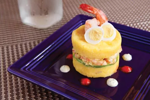 Potatoes, of course, are native to Peru, and appear in various guises at Aji Picante. An especially satisfying, and slightly upscale, example was causa de langostinos. This appetizer was served in the form of a cylindrical tower of chopped shrimp and avocado in cilantro aioli layered between gorgeously yellow mashed-potato cakes, all topped with a large shrimp and a halved, hard-boiled quail egg. The presentation was striking, but it’s really all about the flavors. Lime and aji amarrillo — a yellow chile sauce — added zest to the potato’s earthy flavor without overwhelming the more delicate shrimp, avocado, citrus and herbs.