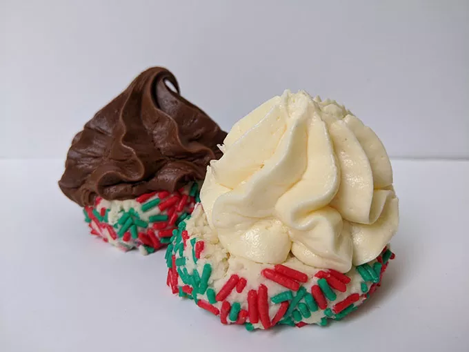 Two inches of icing top every thumbprint cookie from Prantl’s Bakery – two inches of sugary, whipped icing on a thin slice of crumbly, sprinkle-studded shortbread. As a finished product, each towering treat stands about three inches tall.