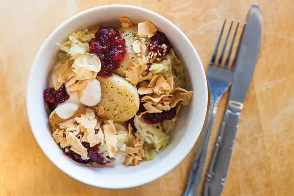 The raw physical space Apteka occupies could read as hipster affectation, but it pretty honestly is what it is: cinder-block walls and concrete floor, lightened by a bare-wood bar and a few decorative touches, most notably flower arrangements that put carnations in a bottle to shame. Apteka demonstrates — in case there was any doubt — that in the right hands, neither vegan food nor bare-bones decor has to be austere.