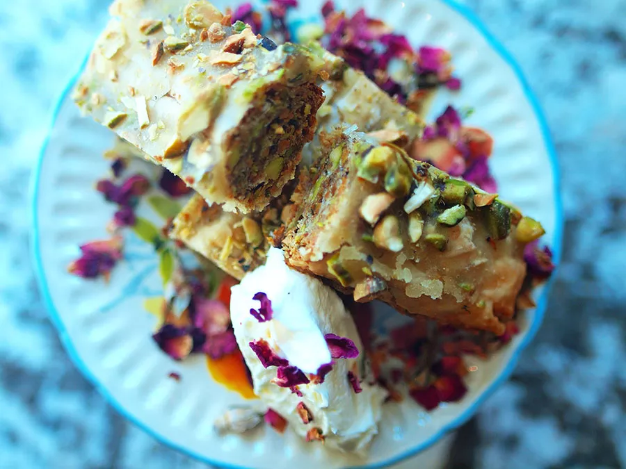 Sandwiches are based by Nowicki’s homemade flatbread, each piece griddled with balloon-like edges. They’re experimenting with Moroccan skewers and cookie recipes, and already have regulars who come to the stand just for the cucumber and feta salad. Nowicki’s round baklava alone is worth a visit to the market; the syrupy pastry bursts with sweet spice.