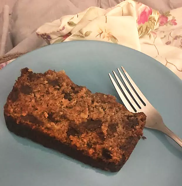 For the prep, mix all the dry ingredients together in one bowl. Cream the sugar, oil, milk, vanilla extract, lemon and egg in a separate bowl. Mash your bananas, and add it to the wet mixture. Combine the dry and wet ingredients, and stir together well. Then add the chocolate morsels. Like, as much chocolate as you want. I used half a bag of dark chocolate, but no judgment here if you want to go full-bag. Grease a bread pan, and pour the mixture in. Bake at 350 degrees for one hour, or the amount of time it takes to get the “no one new around you” message on Tinder and decide you don’t ever want to be naked in front of anyone ever again anyways, or when a toothpick inserted into the center comes out clean.
