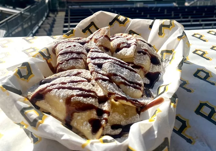 PNC Park will unveil some new grub on Fri., April 5 when the Pirates return for their home opener. Aramark Sports + Entertainment, the park’s food vendor, announced the Pittsburgh-centric Renegade Hot Dog, a foot-long hot dog topped with mini pierogies, pot roast, caramelized onions, and pickle slices. Cannonball Burger in section 146 will offer the cheese-filled Sweet Pierogi, a sweet variation on the usually potato-filled favorite topped with chocolate sauce and powdered sugar. Chicken Pitt in section 147 will have a chive bratwurst served inside a Martin’s Potato Roll with peppers, onions, and deli brown mustard. Aramark also partnered with two Pittsburgh restaurants in the ballpark to offer new dishes: LowKey will serve roasted corn on the cob, birria beef nachos, and caramel-stuffed churros at Nachorita (section 138); and Chicken on the Hill slings chicken biscuits with house pickles in partnership with Coop de Ville (section 144). If you’re thirsty from all the pierogies, Aramark also brings its grab-and-go beer market, Walk Thru Bru Express, to the ballpark.