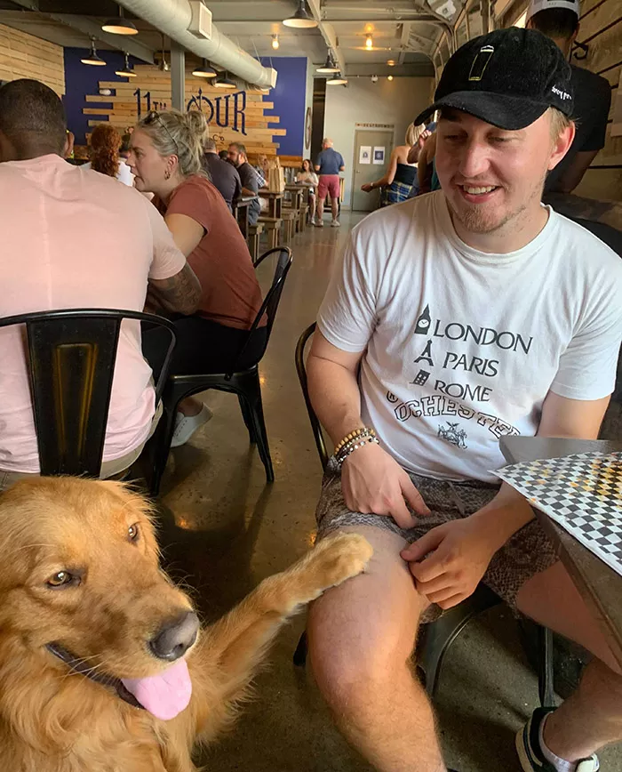 Owen Gabby and Archer, Eleventh Hour’s house brewery dog, become new BFFs. Credit: CP Photo: Alex Kilyanek