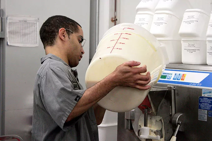There’s a standard base: milk, cream, sugar, salt, and egg yolks all mixed in a big pasteurizing machine. After about three hours, you have several buckets of that base and from there you’re adding to it, you’re making chocolate or making coffee or making dolce. After you’ve flavored the base, you put it into the smaller ice cream machines and then it gets frozen from there. Once you have the base done, it doesn’t take that long. For a three gallon ice cream bucket, it can be frozen completely in one-and-a-half, two hours.