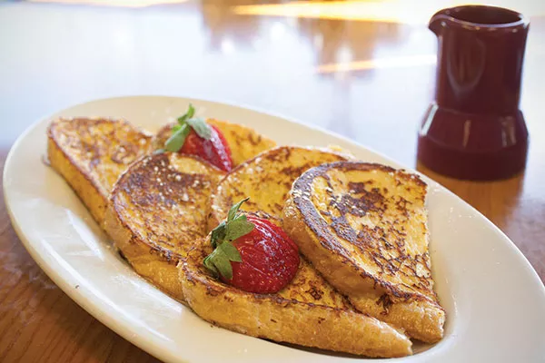 Batter-dipped for an order of French toast, the aforementioned Mancini’s bread was well-griddled, leading to plenty of savory browning on the outside. Cinnamon-raisin and fruit-filled versions round out the French-toast offerings on the extensive breakfast menu. We also liked that the Belgian waffle wasn’t merely an oversized version of the American style, but featured a rich, almost whole-wheaty chewiness inside a crisp, brown exterior. The fruit cup — with cantaloupe, banana and strawberries — served alongside was actually fresh and bright, not bruised and sad. A savory side of corned-beef hash included green pepper and onion, welcome additions that made up for less crust than Jason would prefer.