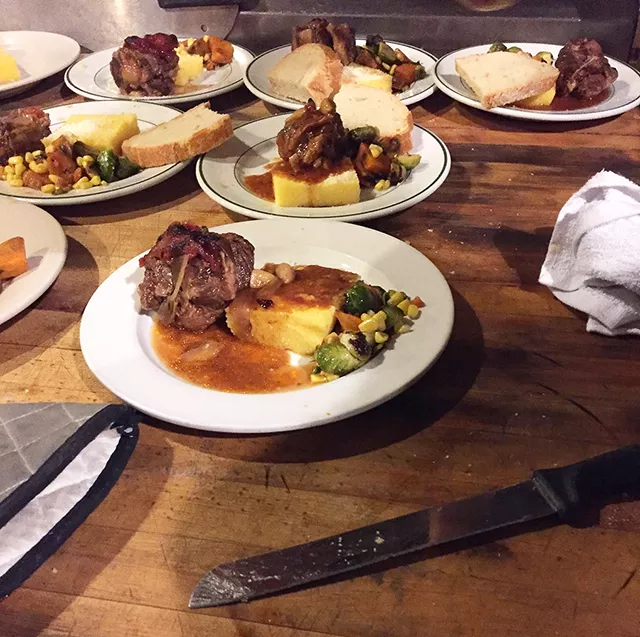 When café doors open to a family of strangers on a first Friday, Enrico’s rustic garage is outfitted with one, long table that stretches the length of the restaurant. Diners are seated snugly next to one other, bumping knees and brushing elbows.
