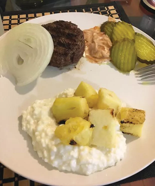 Once the burger is finished and the pineapple looks softer, spoon some cottage cheese onto a plate, along with your preferred burger toppings. Slide the pineapple onto the cottage cheese, mixing it around a little. Now you’re ready to stare at the empty chair across the table, or change it up and watch videos of cats that act like spies.
