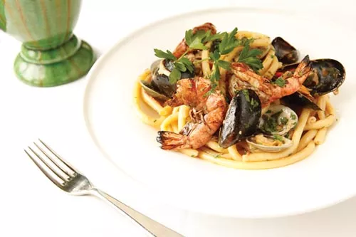 All this added up to our being pretty excited when the space once occupied by a favorite bakery was renovated to house a little Italian restaurant on the BYOB side of Braddock Avenue. And we do mean little; before we walked in, we couldn’t imagine more than a handful of tables where we’d once munched on cookies and scones. But with bakery cases and coolers removed, there was room for a dining room that was more intimate than crowded. It helped that the décor balanced classic and contemporary, with a sophisticated taupe-and-merlot color scheme and, instead of prints or paintings on the walls, what appeared to be painted, wall-mounted tabletops.