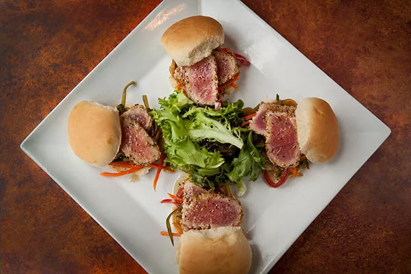 Crab-cake sliders made an impressive presentation with four sandwiches served tops-off, the better to apply some of the greens piled in the middle of the platter. The cakes — a bit bready, but full of crab, not Old Bay, flavor — sat atop an Asian slaw that was bright and flavorful, marred only by too-robust shreds of carrot. Tabasco aioli was both creamy and subtly fiery.