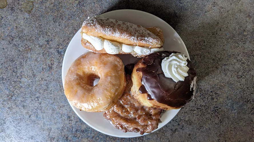 A glazed doughnut, hot dog, Pittsburgh cream, and apple fritter from Father & Son Family Bakery Credit: CP photo: Maggie Weaver