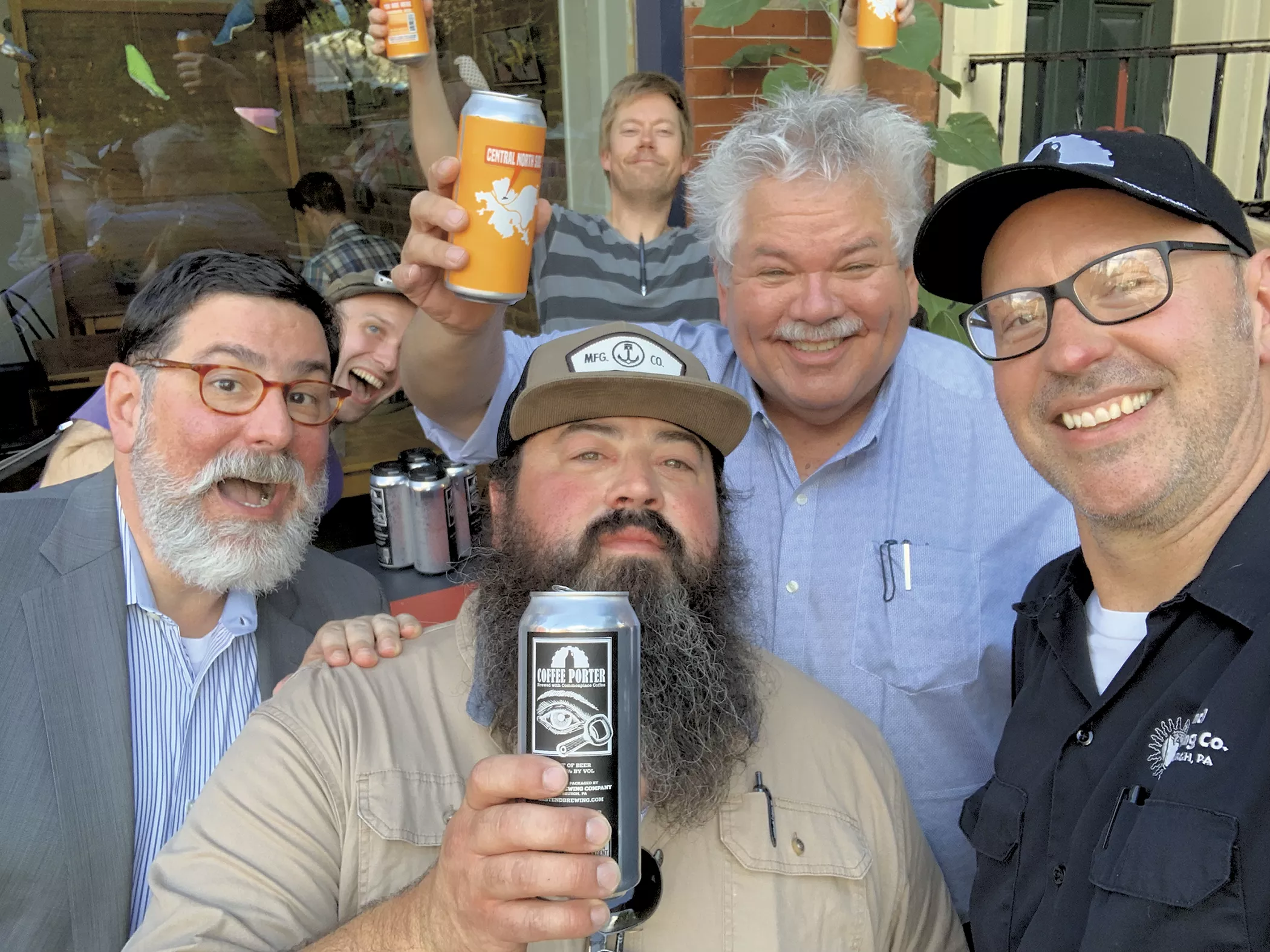 Then-mayor Bill Peduto, TJ Fairchild of Commonplace Coffee, Rick Sebak, and Scott Smith of East End Brewing at the Central North Side beer release party in 2019. Credit: PHOTO: Courtesy of East End Brewing