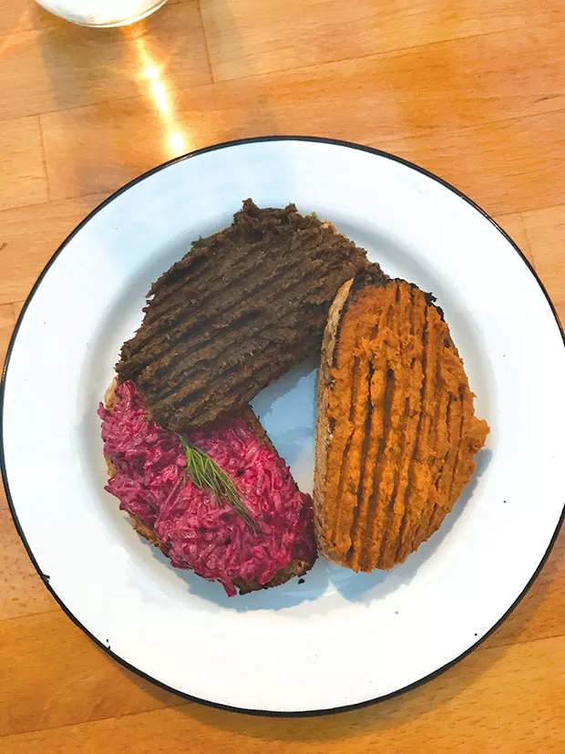 Hot take: Described as tartines on the menu, these hearty toasts topped with three vegetable spreads are bursting with flavor and have a satisfying crunch. The flavors rotate which means ordering kanapki never gets dull. The pink-beet spread was vegetal and light, compared to the spiciness of the mushroom spread.