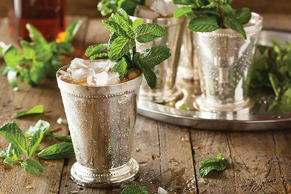 A proper mint julep is elegantly simple, with just four ingredients marrying to create a frosty sip of springtime. Begin by dropping a generous portion of spearmint leaves into your cup. If you don’t have a silver julep cup, a highball glass will do just fine. Add to that a teaspoon of sugar or half an ounce of simple syrup. Lightly crush the mint with a muddler or other blunt object, then add a healthy pour (2½ to 3 ounces) of bourbon. Cognac and Jamaican rum make for excellent variations.