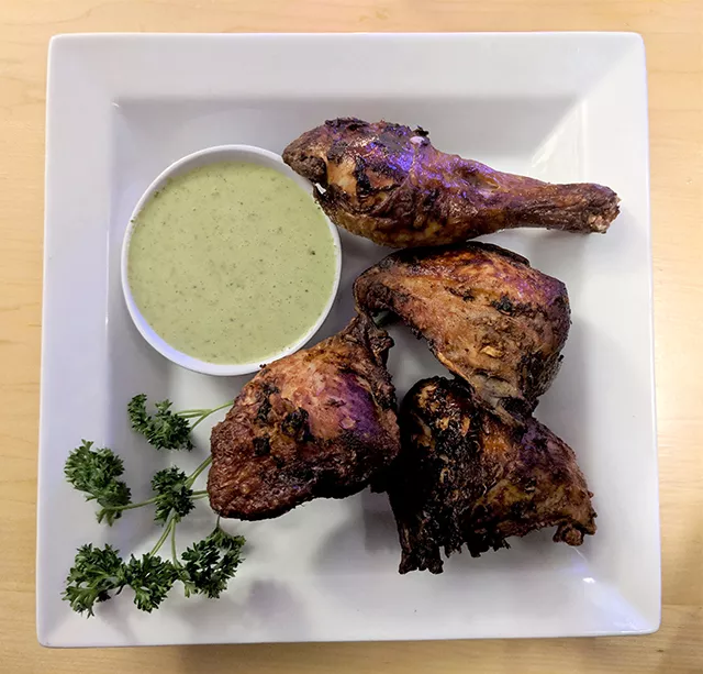 Next to the rolls, four massive pieces of chicken, all steaming with an intoxicating aroma, dressed up a white plate. Cook marinated the chicken for at least two days, resulting in juicy, flavor-smacking meat. The lime, yogurt, and cilantro sauce punched each bite with citrus, breaking through the crunchy, spice-heavy ends of the chicken. The dish had me dancing in my chair.