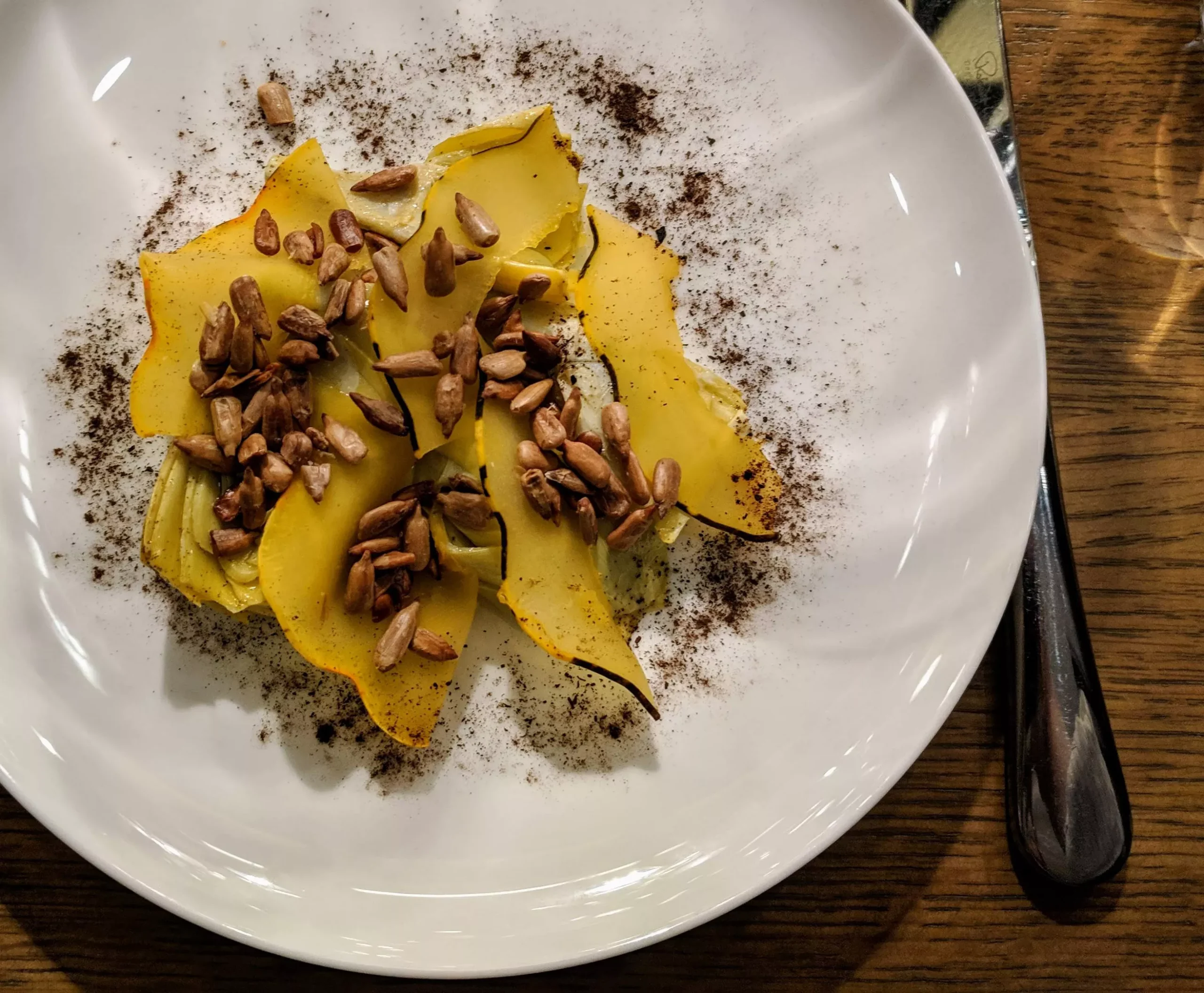 Artichoke topped with sunflower seeds, smoked brined carnival squash, and a dusting of vegetable ash Credit: CP photo: Maggie Weaver