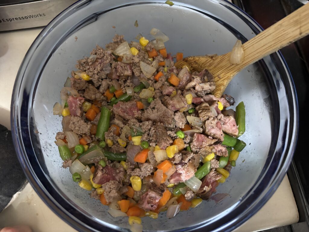 For these particular pot pies, I’m using some leftover mashed potatoes, homemade demi glacé, and sirloin, plus a pound of lean ground beef. For the vegetables, I’m using a bag of Aldi’s frozen mixed veggies, which costs about a dollar.