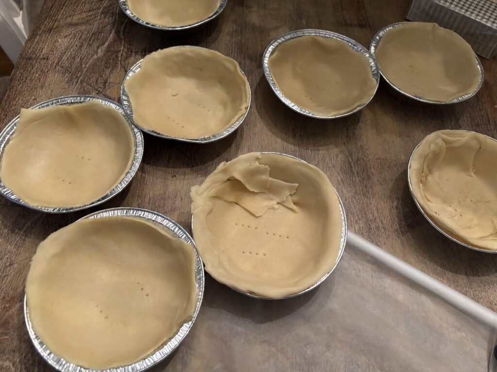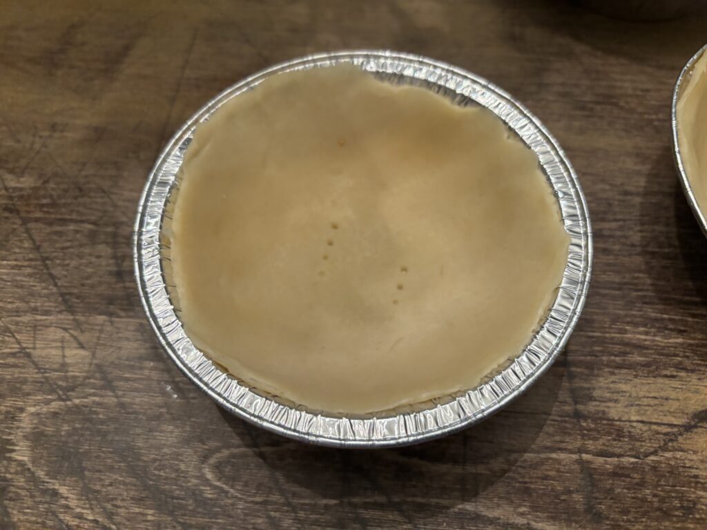 Take your pie crusts out of the fridge and let them sit for about 5 minutes. Roll them out and lay your pie pans on top of them, top side down. Cut out mini crusts with a pizza cutter or a small knife. If you’re using all your leftover scraps to line 1-2 pans, you should have 8 mini pies. Poke holes in the bottoms of the crusts with a fork and set aside.