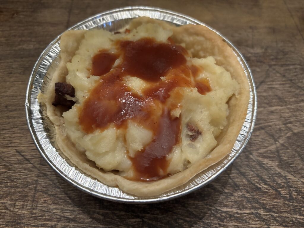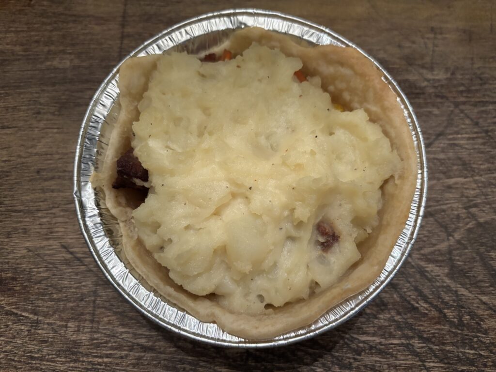 Then, fill your prepared mini pie crusts with the meat, veggie, and gravy mixture. Add mashed potatoes on top, then add your top pie crust (optional).