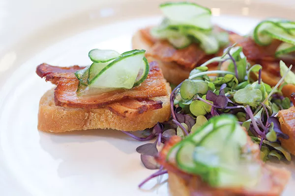 Perhaps the website was exaggerating, or perhaps it hasn’t kept up with the kitchen, whose offerings when we dined were mostly Italian and American with a smattering of international options. A few are vegetarian, but a focus on meat was apparent in the house-smoked barbecue section, as well as the house-cured bacon and pancetta.