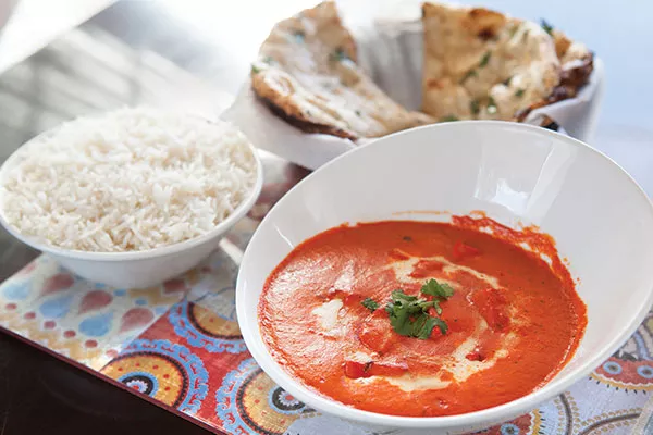 Our starters were more reminiscent of India, but a number were nonetheless distinctive. For instance, the interior of a samosa was bright green from mint blended into the creamy, mashed-potato-like filling. Vegetable pakora — fritters — were the best we’ve had at any restaurant, Indian or otherwise, with just enough batter to hold together just-cooked vegetables and chopped greens. Best of all was the texture, with well-fried, crispy crags formed by the rustic mix of ingredients. Strips of chicken and paneer (cheese) came coated in a chickpea-flour-based batter that was puffy and golden, like beer batter; some had a reddish hue that suggested a dash of hot sauce had been added.