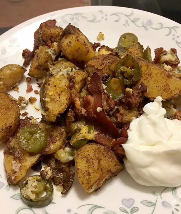 Set a medium pot of water to boil and scrub the potatoes clean, leaving the skins on. Boil for approximately 30 minutes. For a real French-cry kind of dish, you can listen to Edith Piaf’s “Chanson Bleue” on repeat or queue up Amélie if you’re feeling slightly hopeful, like maybe there is another weirdo out there who cries a lot while doing things like weeding a garden. Once the potatoes have cooled enough to handle, cut into wedges and put in a bowl with a lid. Add olive oil and spices, secure lid and pretend you’re using a Shake Weight for 30 seconds, which if you’ve ever used a Shake Weight is about how long anyone lasts. Spread potatoes onto a pan and bake for 10 minutes at 450 degrees. Flip the potatoes and add cheese and other toppings. Bake for another 5 to 10 minutes. Substitute Greek yogurt for sour cream so you have one less thing to feel bad about.