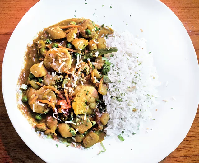 The West Indies curry was, according to our server, just like his grandmother’s. Curry, paired with roti and rice, was intensely earthy and savory, not sweet like a Thai or Indian curry. It featured fresh, plump shrimp, so fresh I expected a boat to pull out of the parking lot. The roti —a circular, pressed, pan-fried croissant —dazzled me.