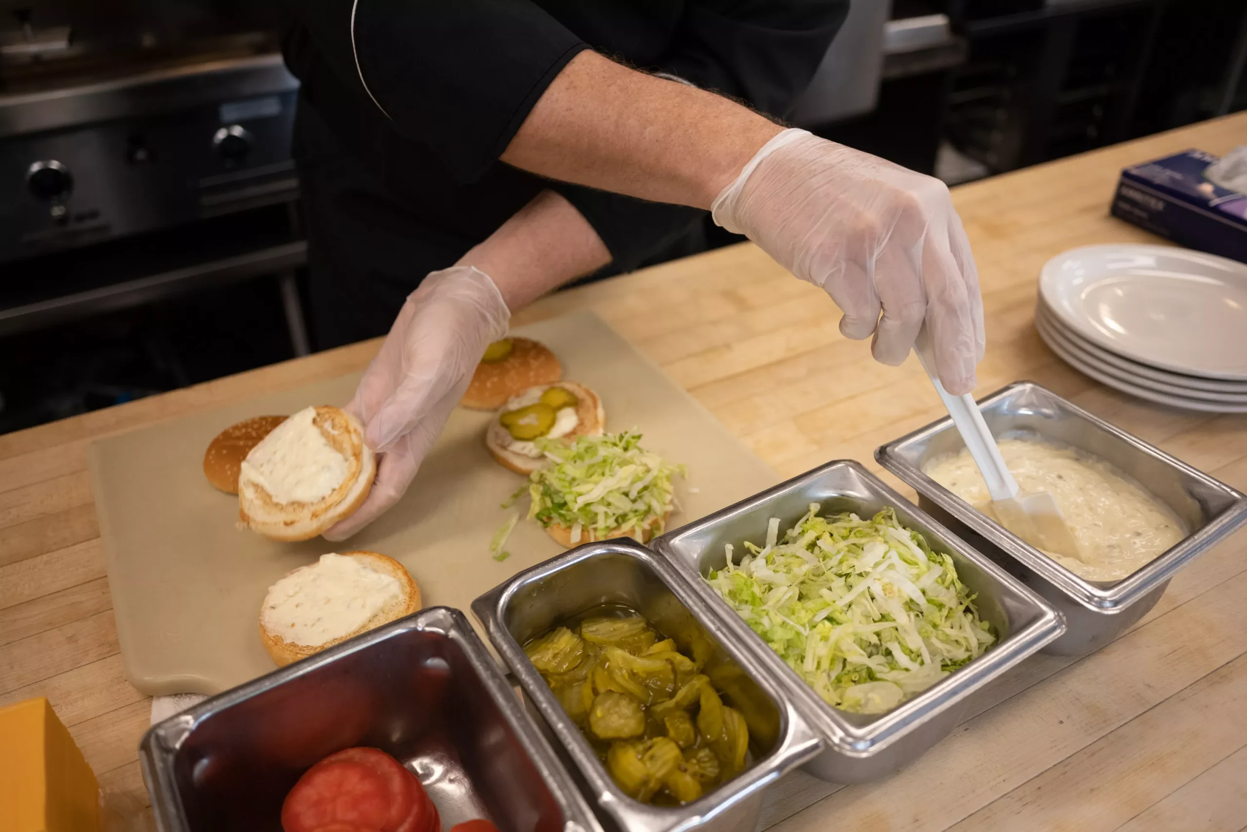 Once the patties are grilled, Frick finishes assembling the burger quickly, conscious of its weight as he finishes “the build.”