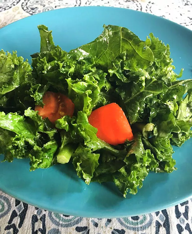 Pour all of the ingredients into a mason jar and shake them up before adding to the kale. This will yield a fairly vinegary dressing, so adjust according to your taste. You likely won’t use all of it in one sitting, so I suggest drizzling some onto the greens and then getting those limber fingers wet and to work. Add in more dressing as needed and top with your favorite salad fixings.
