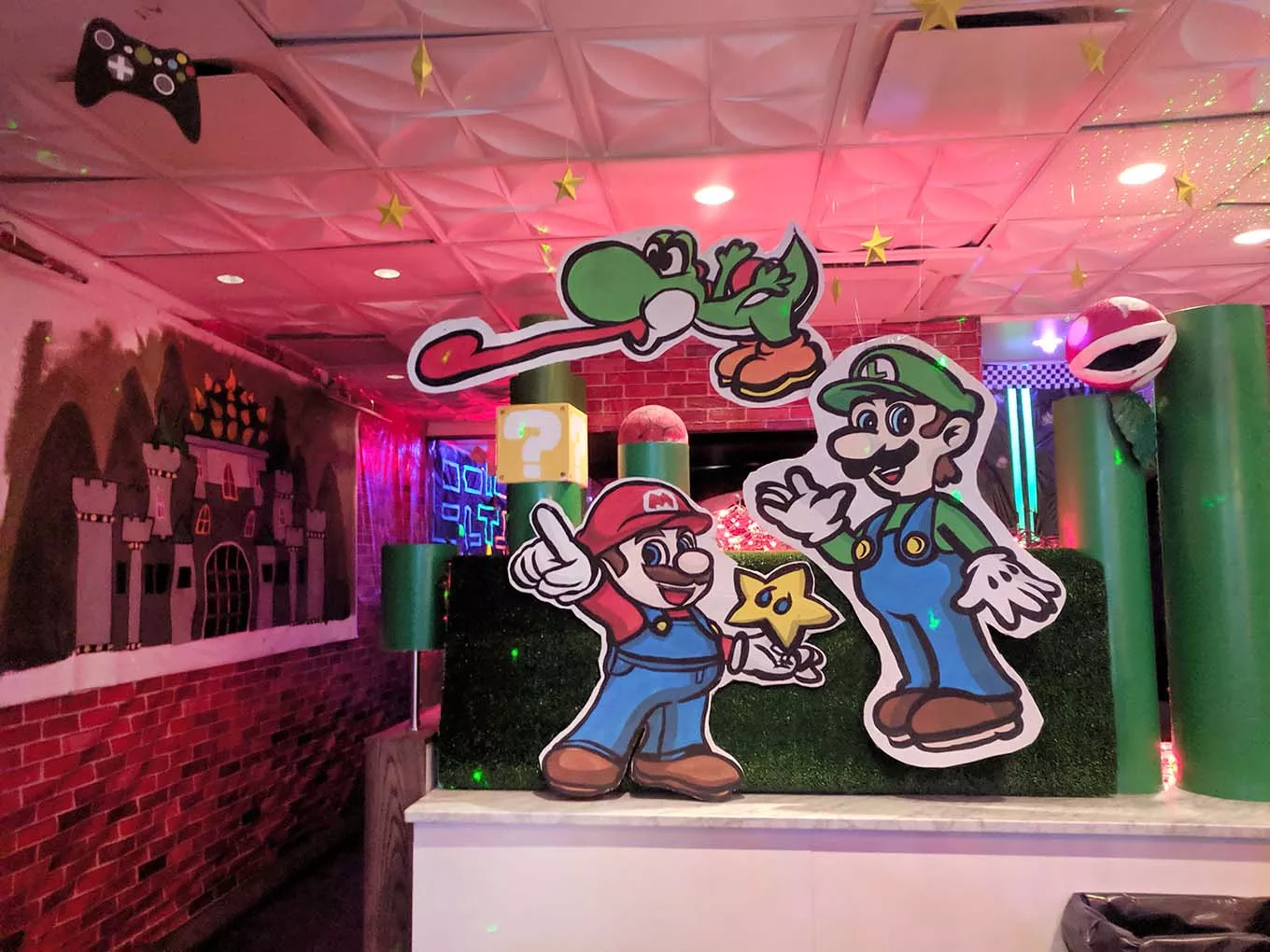Level Up, the latest from Pop Up PGH, an ever-rotating bar that’s hit all major holidays and Game of Thrones, is now set to the tune of 8-Bit. Every inch of its white walls is covered by fake brick, maps of gamescapes, or giant versions of the games themselves. Cut-outs of Bowser, Princess Peach, and other beloved characters are plastered between Nintendo’s signature green pipes; Mario and Luigi wave from behind the bar. Drink and compete on the two fully-functional consoles: a flat-screen displayed Nintendo and a classic arcade machine.