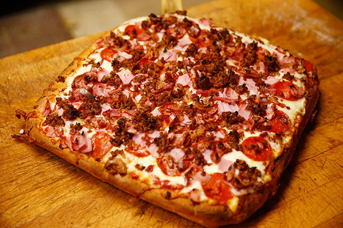 The Sicilian, on the other hand, was straight up blissful. It was doused in butter with a crust so thick most of the sauce was absorbed, yet the edges remained crunchy. The pie rose in a way similar to a pan of brownies, giving the crust a fluffy, pillowy texture in the center. The cheese was a standard blend of mozzarella and provolone, but fooled me into thinking it was Swiss. This “unique” characteristic was the result of another secret process, says Neal.
